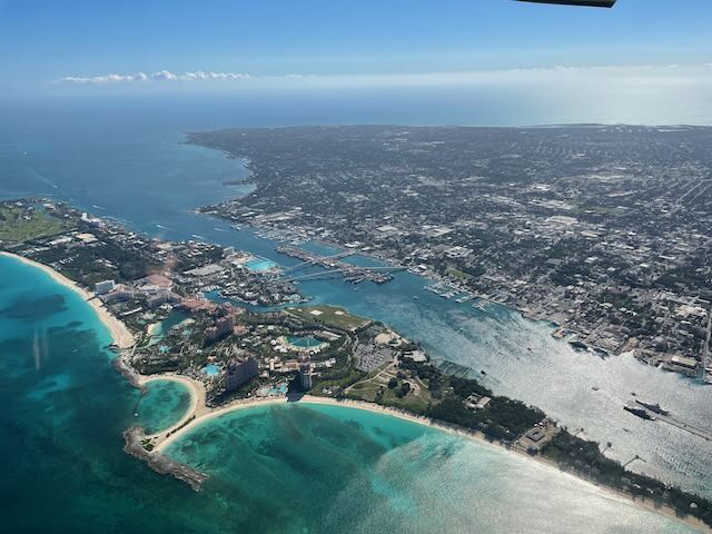 The next day, I loaded up with my boys, and we launched east over the water. KFXE, Fort Lauderdale Executive, is a really nice airport and friendly to GA traffic. The corporate jets come and go and mix with us lowly piston-prop people quite nicely. I’ve taken off from KFXE for the Bahamas a few times, and it came pretty natural to me to lift off of runway 09, set climb power, and watch the coast of Florida slide beneath us as we turned toward Nassau. My wife and our daughters had taken off from Toronto on Westjet Flight 2754 about an hour prior, so as we settled into our final cruise altitude of 11,000’ and out of curiosity I tried to find their flight on my traffic display. No joy, but I knew that the timing should work out pretty good, as we would arrive about an hour before they would. The 162 nautical mile flight from Fort Lauderdale to Nassau went by quickly. Total time was scheduled to be about an hour. But the scenery was changing: from the lush green of the Florida Everglades to the dark deep blue Atlantic, finally giving way to the aqua, turquoise, and white sands of the Bahamas. I was cleared for the visual on runway 10 at Lynden Pindling International, and after only an hour, had landed in paradise.