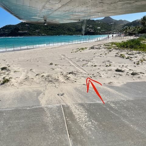 The approach to runway 10 is the most well known, and for good reason. Entry points are either of the islands of Forchue or Grouper. Either of these will orient you to be coming in from the northwest, which is typical, as if you were coming from St. Martin. The islands are easy to identify, and with modern glass panel and moving map technology, simple to navigate to. But it’s just easier when there’s someone in the cockpit with you to help you sort it all out. A report over one of these islands gets you in touch with St. Barth Info, and then it’s direct to Sugarloaf Mountain, another island that acts as the final approach point to turn toward runway 10. In my airplane, I needed to be configured to land, with gear down, prop set to fine pitch, and flaps at 20 degrees just prior to Sugarloaf. At Sugarloaf, if the wind is fairly straight down the runway, you make the turn to the approximate threshold, which you cannot see. If the wind is northerly, you pass beyond Sugarloaf, extending the base leg a little further, and then turn to the runway with a slightly angled approach. The approach is now well under way, and here is where airspeed becomes critical. We picked a good approach speed to try, something I would typically use on a 3% glide slope – 90 knots – for our first attempt. We knew this would be too fast and would almost certainly necessitate a go-around. From Sugarloaf, I got the approach finalized, and continued in. Right before the coast, flaps to 30 and final GUMPS check complete. Another mandatory reporting is necessary on short final, at a point approximately where the sea meets the island, where landing is about to occur momentarily, but you still cannot see the threshold or the runway numbers. This report is necessary to make sure that there is no traffic about to enter or depart the runway – because neither of those would be able to see you at that point in your approach either. From short final, things get busy and intense in short order. The traffic circle, which is busy with vehicles and pedestrians and tourists and planespotters, comes into view. The mountains on either side meet up here. Part way up each mountain slope there’s a windsock for final windchecks, but at this point all of your concentration is directed toward airspeed and glide path that it’s almost impossible to see them. Closing in on the traffic circle is another larger visual – a monument with a large white cross. The goal of the approach path is to be at the same altitude as the cross when over the traffic circle, a task harder to achieve than it would seem. Finally, over the traffic circle, at the altitude of the cross, the runway threshold comes into view, and the designator, 10, is in sight. Now is the time to cut the throttle to idle, push the nose down – instinctively it’s difficult to do. My 210 is a slippery, greasy beast of an airframe, and it loves to pick up speed in any nose-down attitude. But there’s only one way to get to the threshold, and with only 2119’ of downsloping runway in the crosshairs to land and get stopped on, time is of the essence to get there. I push the nose down, against all instinct, and we begin our rapid descent down the hill, with tufts of long grass waving in my downwash barely 20’ below my toes. Finally we cross the end of the runway, having picked up some airspeed, and I naturally flare over the numbers. Meanwhile my instructor is coaching, encouraging, and keeping an eye on the critical factors, mostly airspeed – be ready to go around. Making that decision is pretty simple. About 900’ down the runway is a taxiway on the right hand side. If you can touch down before the taxiway, continue the landing. If you float by it, go around. It’s that simple. My first attempt with the 90 knot approach speed yielded the results we expected… a touch down about 150’ beyond the taxiway. Full power is applied, gear comes up, flaps in stages. We are going around. It’s fairly simple to fly the circuit from this point. Just climb out to beach at the threshold of runway 28, make a left hand turn to the island of Fragete, and then back to Fourchue where it all began. The second attempt was better – we adjusted approach speed to 85 knots – I think I did touch down just a few feet before the taxiway, but a go around was initiated just to be safe. On attempt #3, approach speed down to 80 knots. Not 78, not 82 or 83, 80. 80 exactly. I immediately noticed the difference as I pulled back to flare. The airplane responded with lighter feedback to the yoke, and I could feel the pivot of the airframe just prior to the point of ballooning, which had come so easily and immediately in the prior approaches. This time I could feel it all the way through the flare to touchdown. Three greasy chirps, and immediately the flaps are retracted to reduce lift and get better braking action. Touchdown was nicely 200’ before the taxiway. I rolled out to the end of the runway, soaking in the view of the beach, watching a windsurfer cross the runway centerline about 200’ out. I had just landed my own airplane at St. Barth’s.